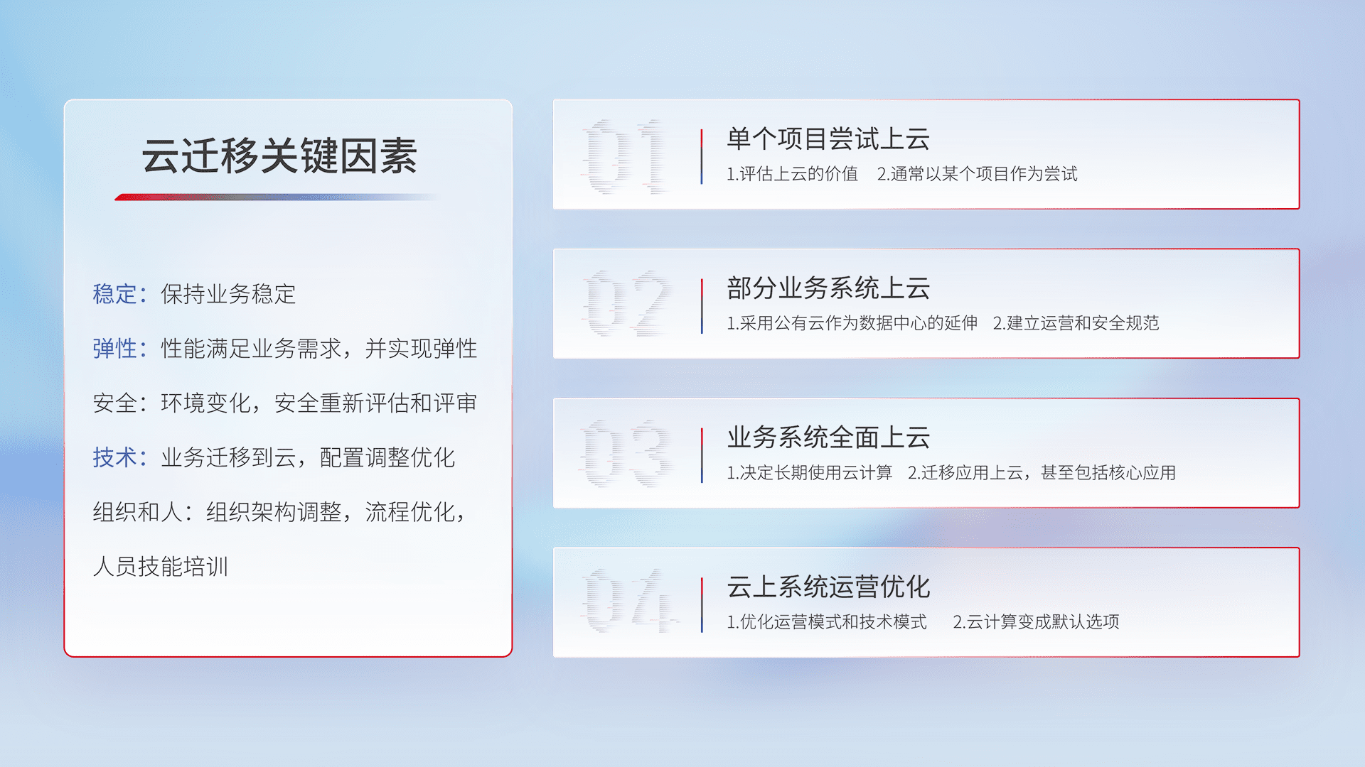 结合实际业务,,,从规划设计、、云平台选型、、、云原生改造、、、、数据迁移、、、、集成交付,,迁移全过程为客户识别最佳上云路径,,,,做好风险识别管理,,,,设计网络架构、、、身份权限、、安全审计合规、、、操作审计、、、日志审计、、、、监控告警策略、、、、多站点容灾设计等,,,对云上基础设施进行整体规划,,,提升IT治理水平,,以满足弹性、、、、高可用、、、高性能的需求。。。