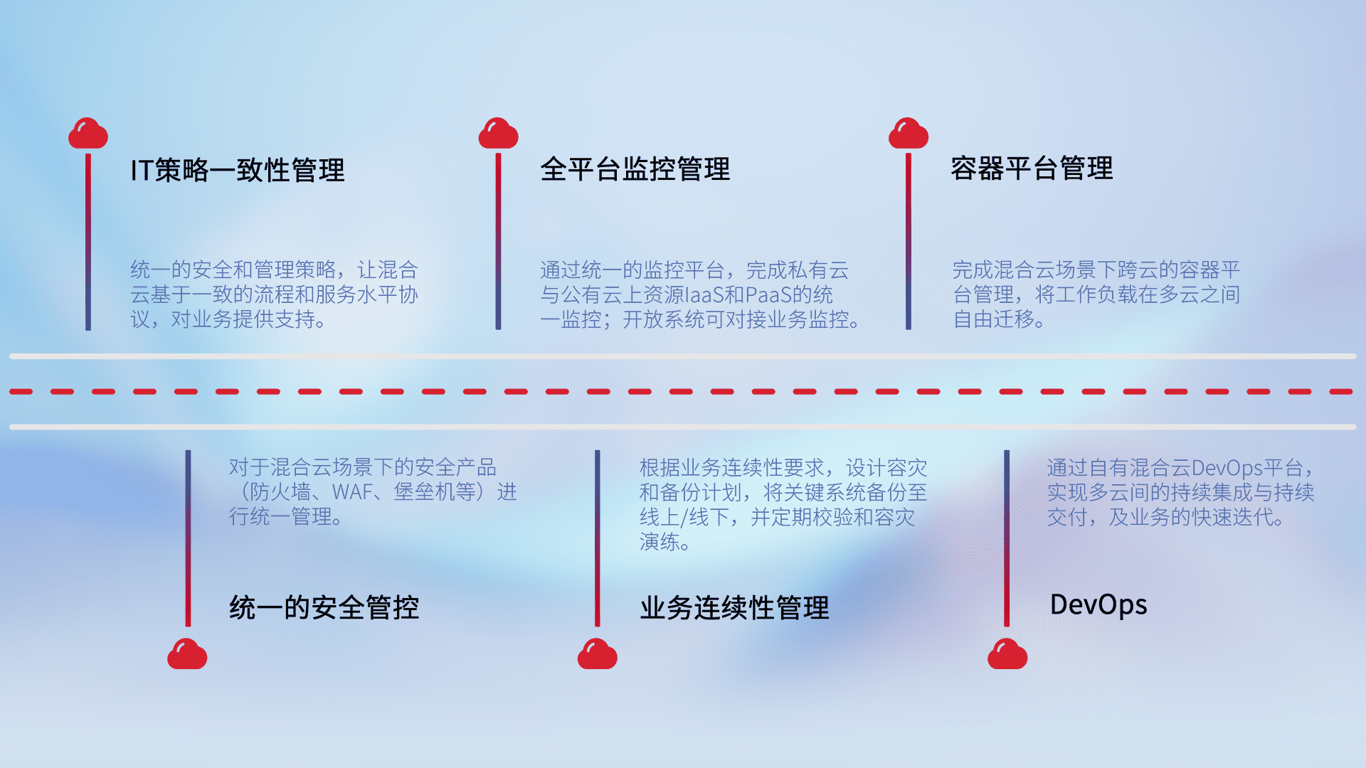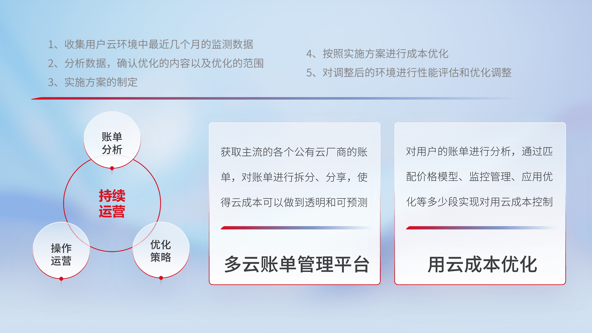 通过多云纳管,,,,以统一的资源数据模型把客户的云资源进行抽象和封装,,,,进而实现对多云资源的统一操作,,,保障云资源管理的可靠性、、、稳定性与可用性。。。。量身定制化运维内容,,,,配置、、、、开发运维、、、、补丁管理、、、备份、、监控、、、认证和访问管理、、、审计和日常巡检等,,保障在用云过程中的可靠度,,,,稳定度以及高可用率。。