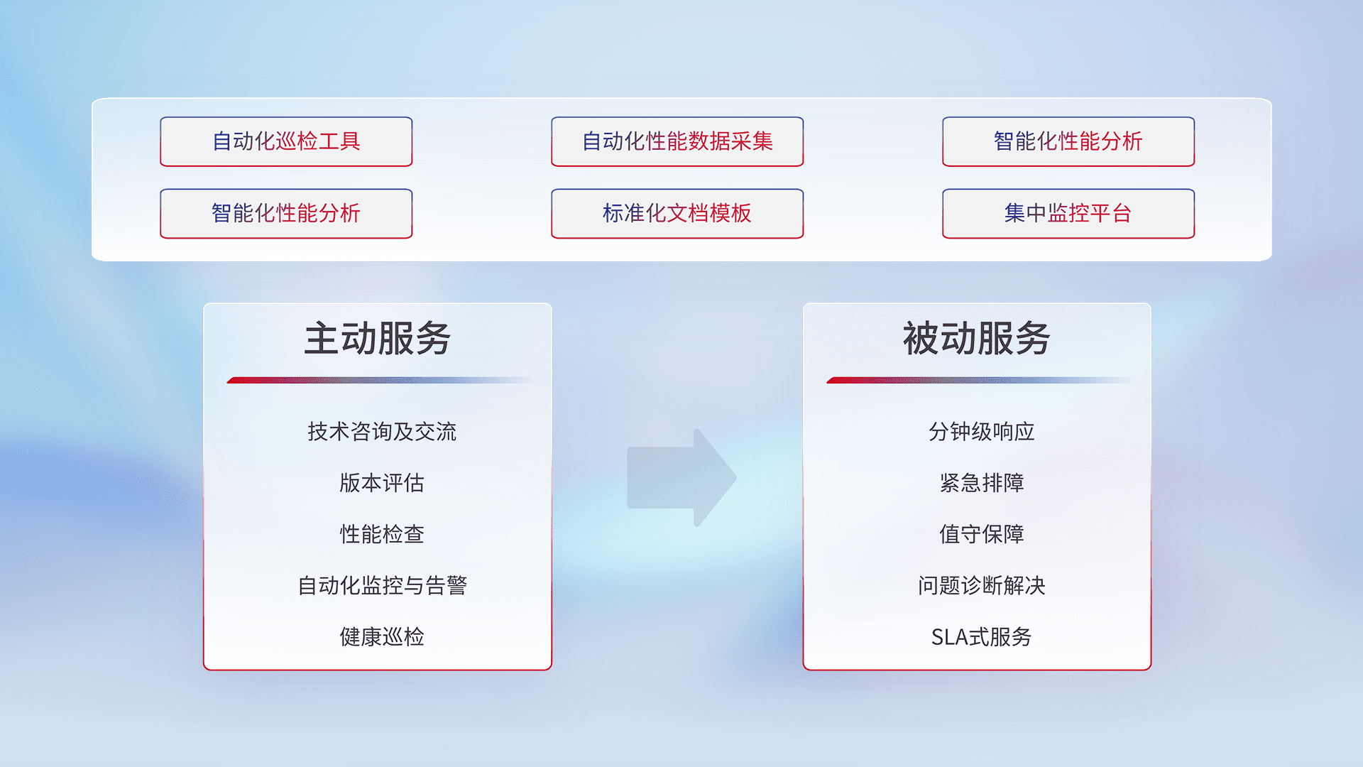 智能化工具和标准化文档,,保障服务质量,,,提供主动服务(包含技术咨询、、、、版本评估、、、性能检查、、、自动化监控与告警、、健康巡检)和被动服务包含(分钟级响应、、紧急排障、、值守保障、、、、问题诊断解决、、SLA服务)。。。